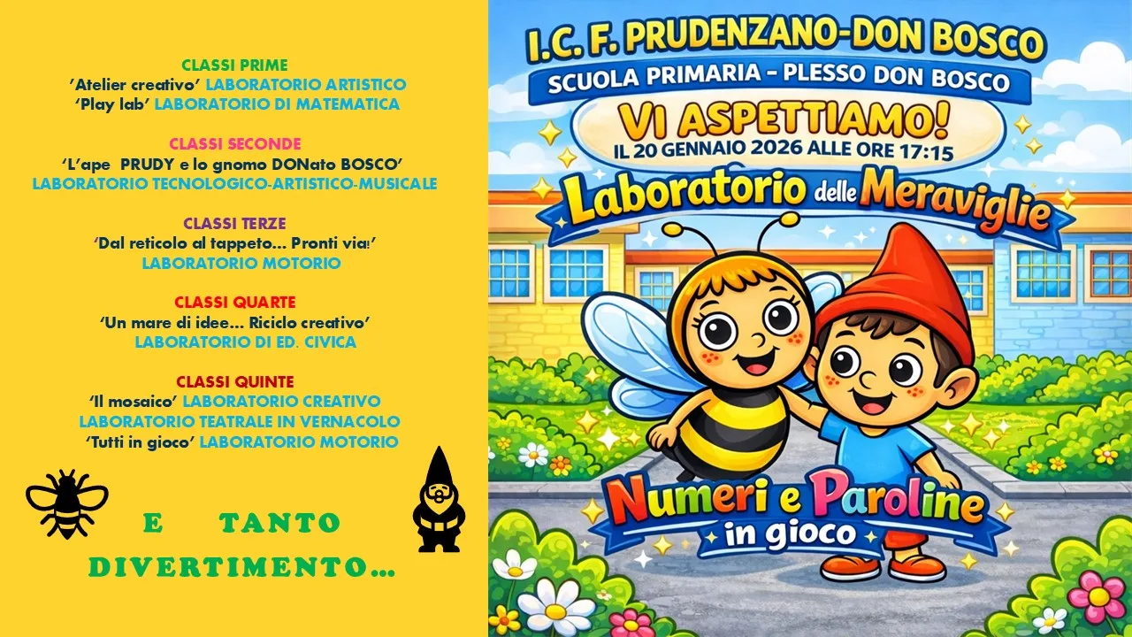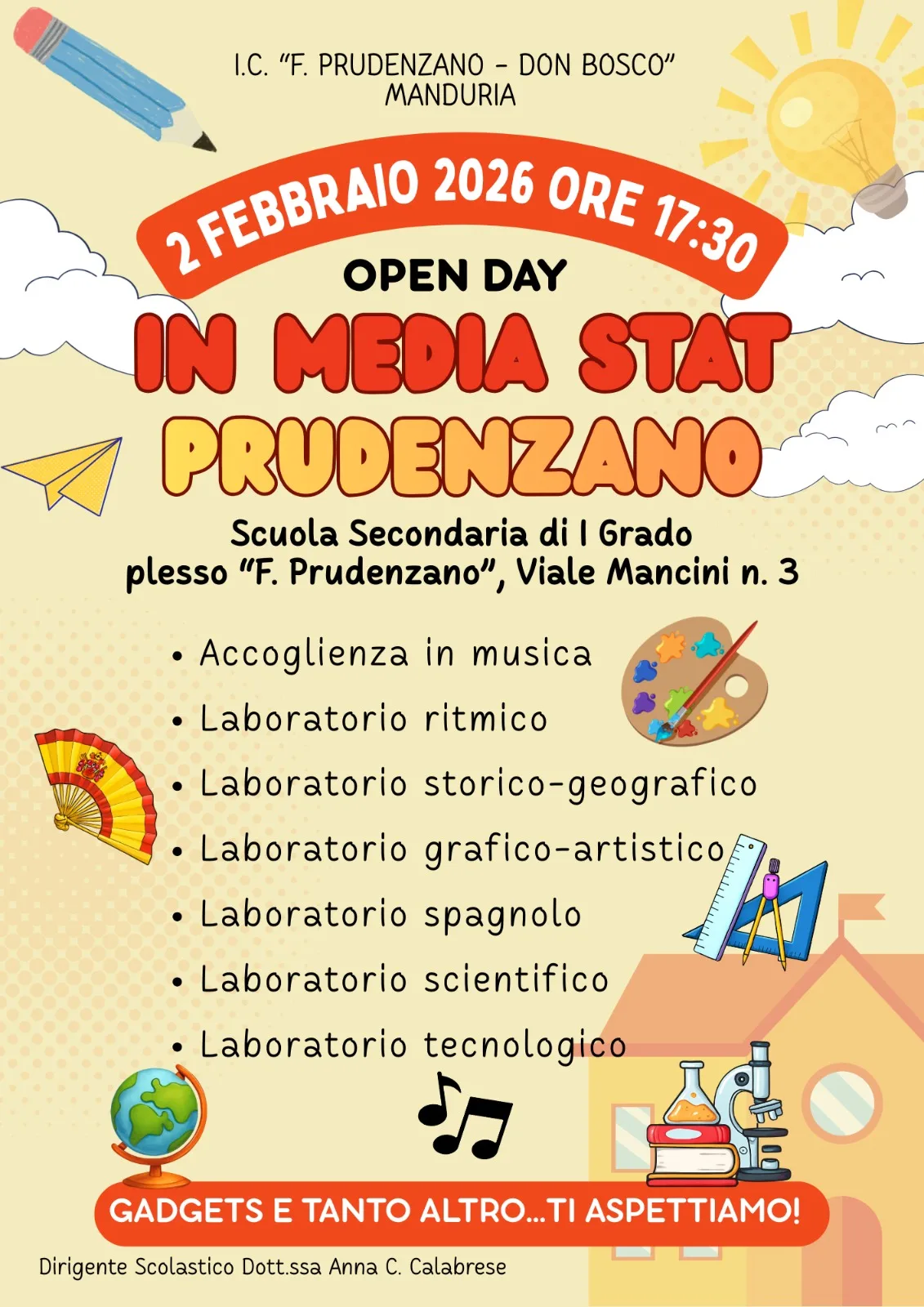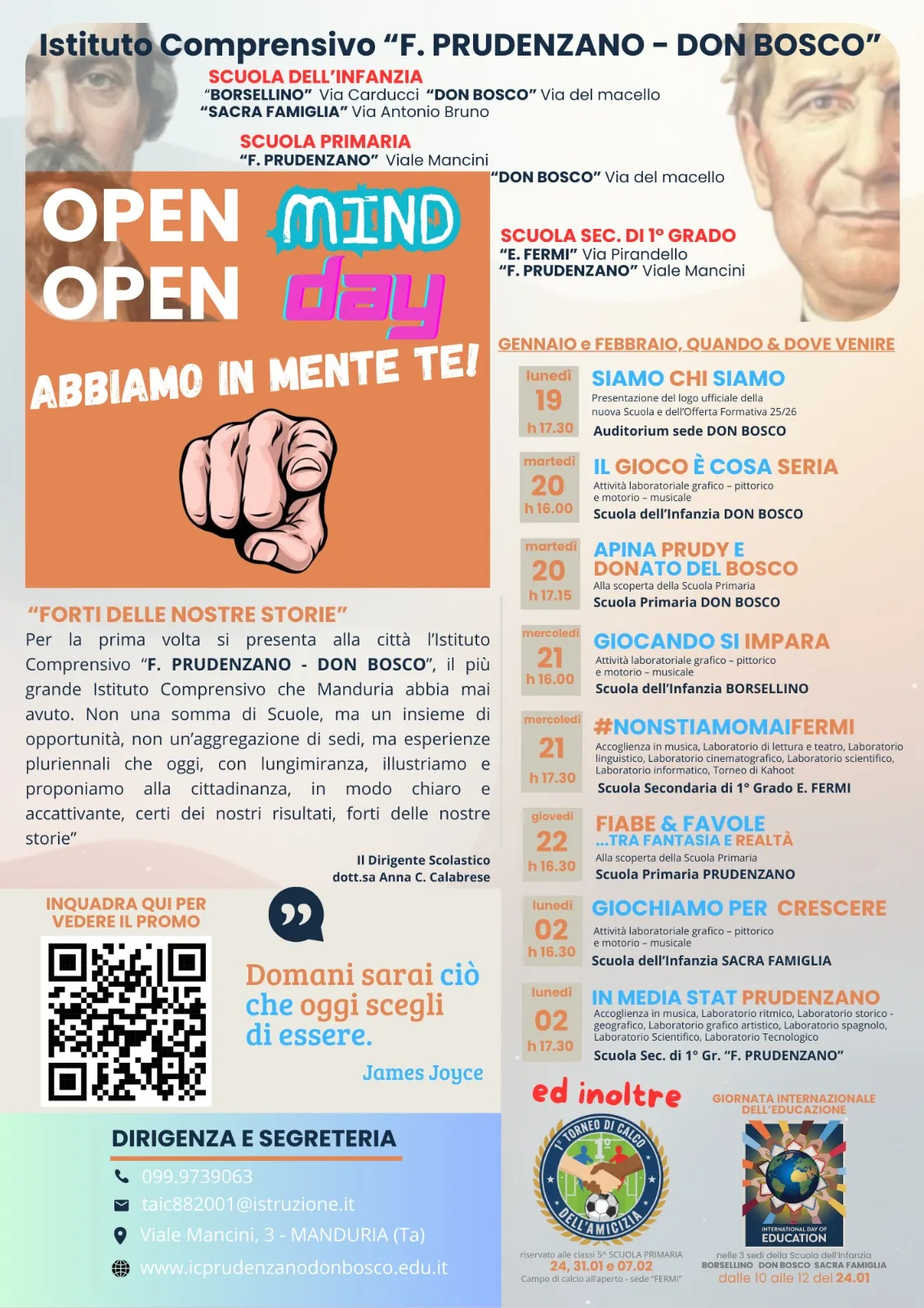 Per la prima volta si presenta alla città l’Istituto Comprensivo “F. PRUDENZANO – DON BOSCO”, il più grande Istituto Comprensivo che Manduria abbia mai avuto. Non una somma di Scuole, ma un insieme di opportunità, non un’aggregazione di sedi, ma esperienze pluriennali che oggi, con lungimiranza, illustriamo e proponiamo alla cittadinanza, in modo chiaro accattivante, certi dei nostri risultati, forti delle nostre storie”